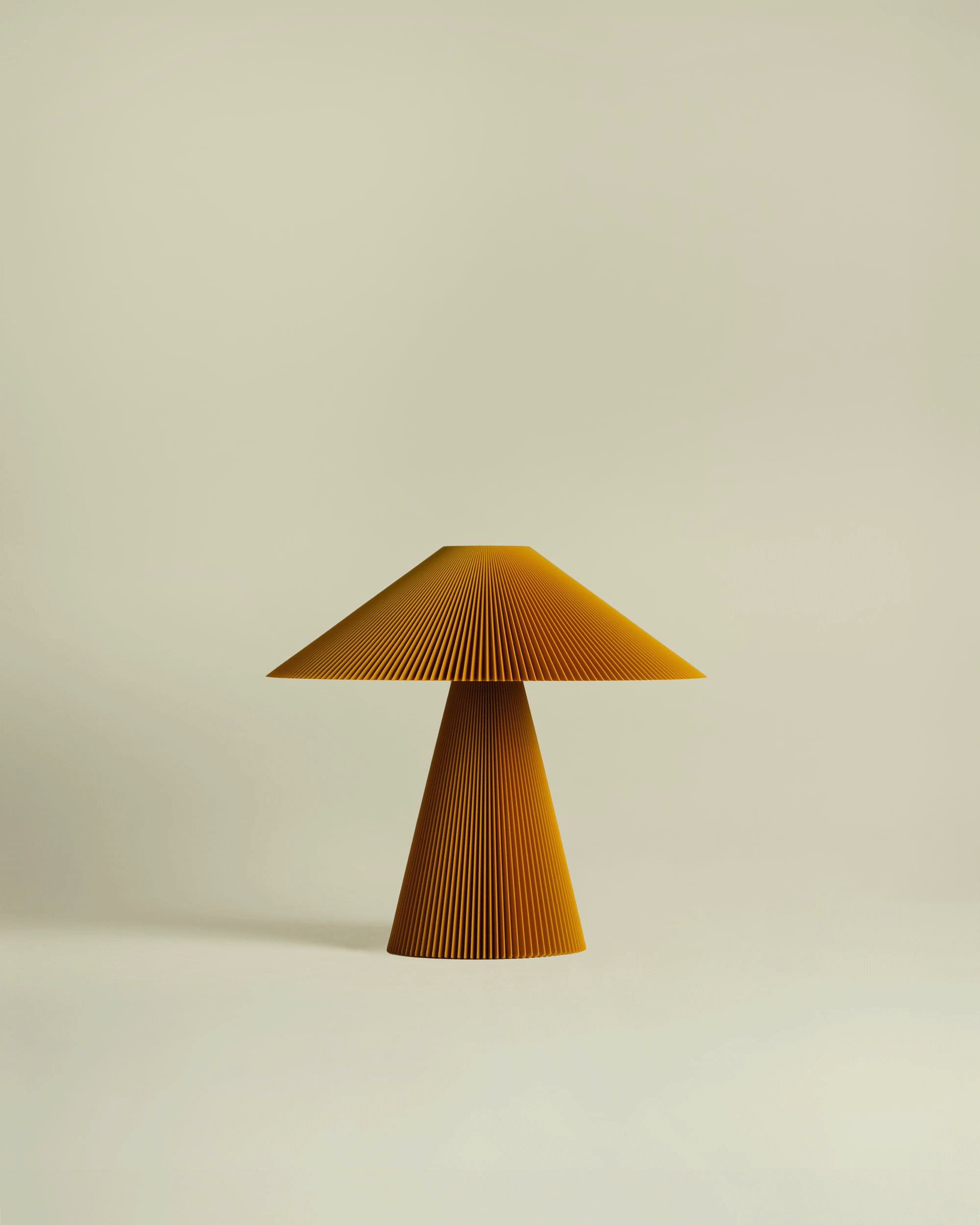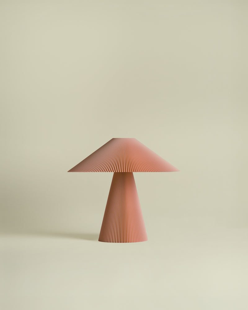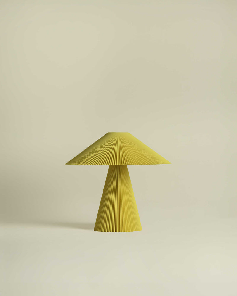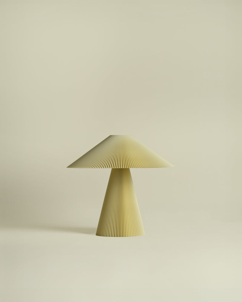 A table lamp with an architectural presence and tactile pleats. Standing as a sculptural gesture within any room, fully dimmable to match every mood.