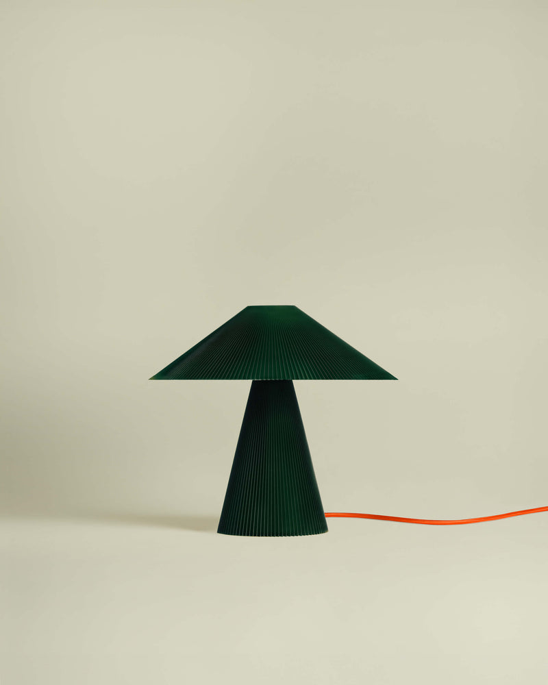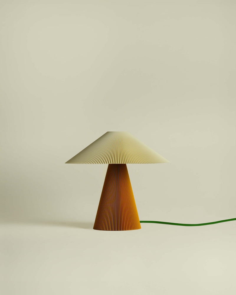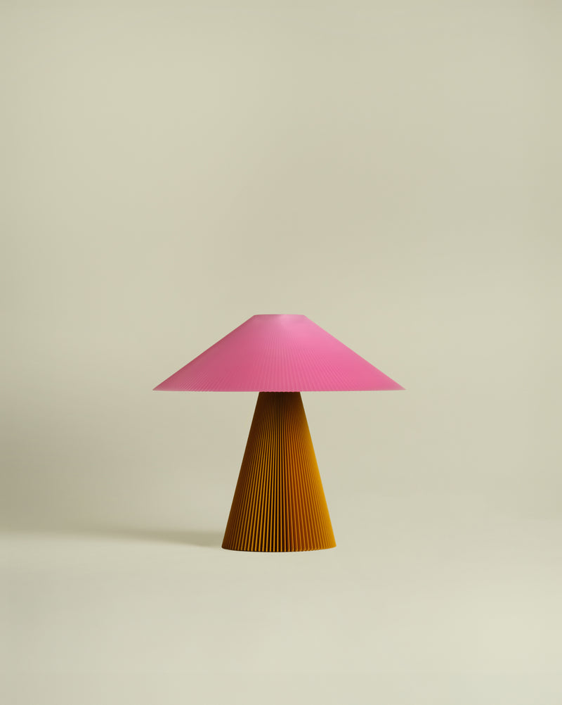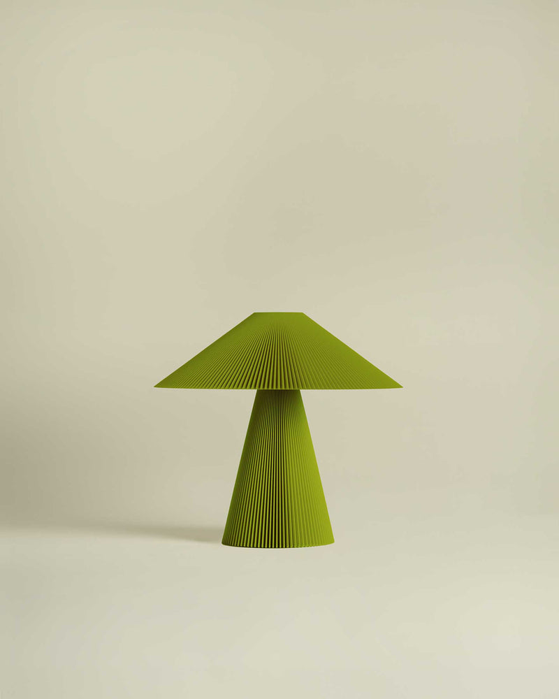 A table lamp with an architectural presence and tactile pleats. Standing as a sculptural gesture within any room, fully dimmable to match every mood.